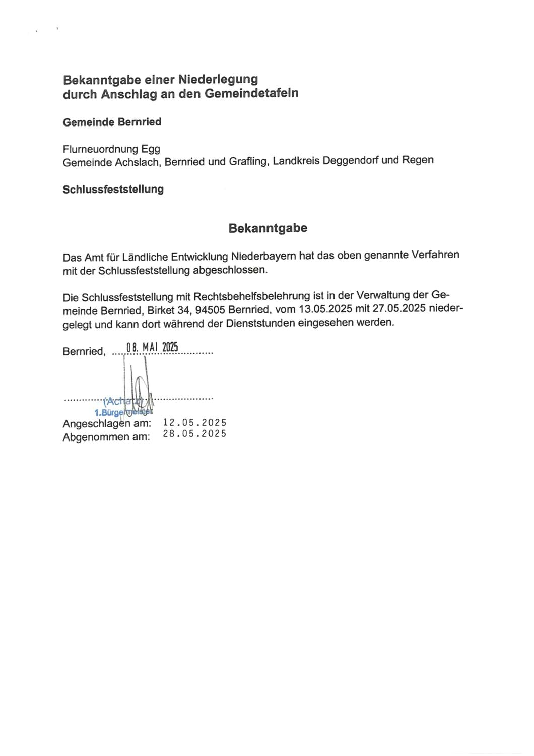 Meldung vom 09.05.2025 Bekanntgabe einer Niederlegung durch Anschlag an den Gemeindetafeln - Flurneuordnung Egg