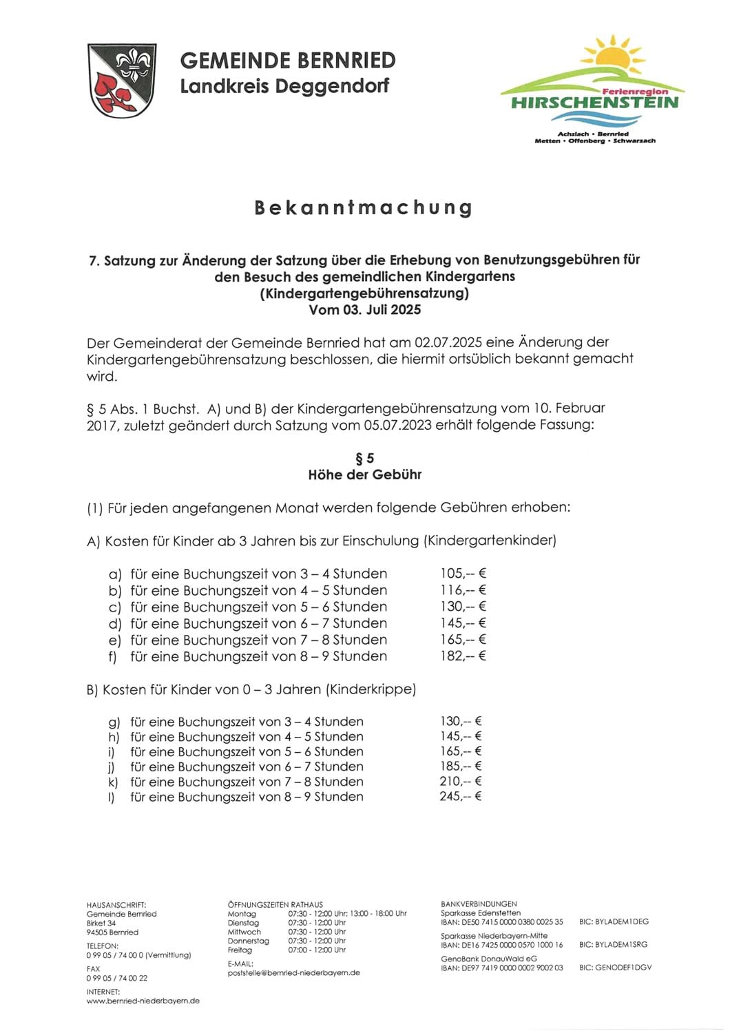 Meldung vom 04.07.2025 Bekanntmachung - 7. Satzung zur Änderung der Satzung über die Erhebung von Benutzungsgebühren für den Besuch des gemeindlichen Kindergartens vom 03. Juli 2025