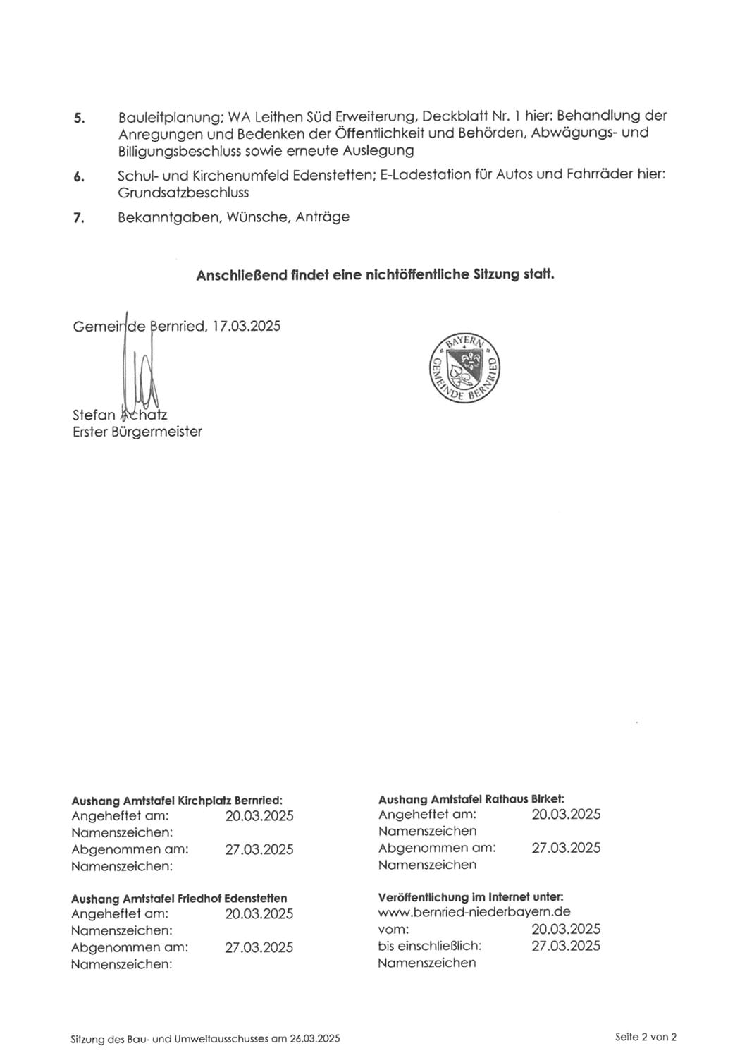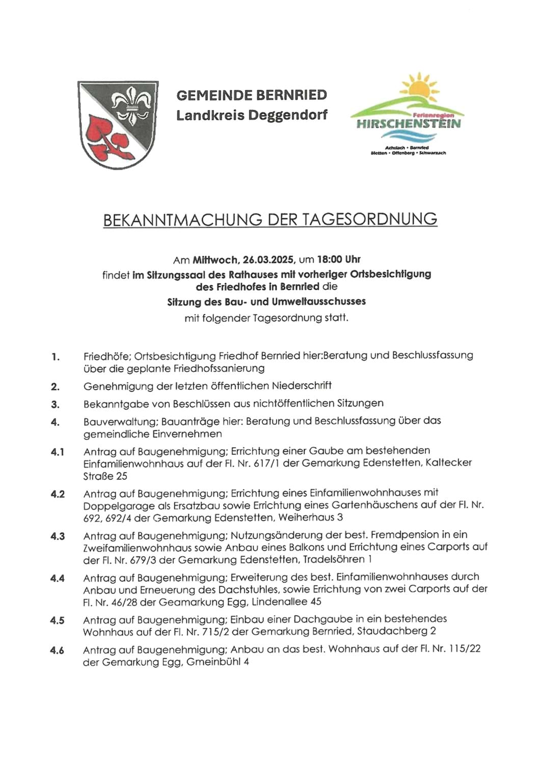 Meldung vom 20.03.2025 Bekanntmachung Bau- und Umweltausschusssitzung am Mittwoch, 26.03.2025
