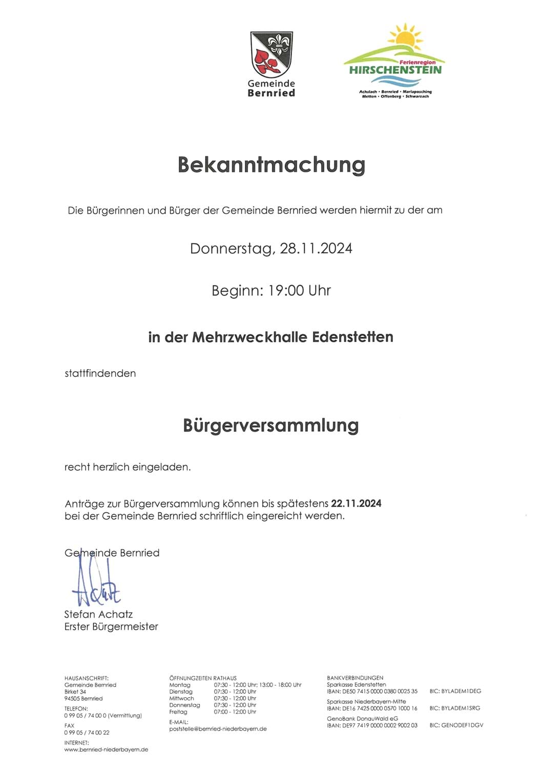 Meldung vom 08.11.2024 Bekanntmachung Bürgerversammlung 2024 der Gemeinde Bernried