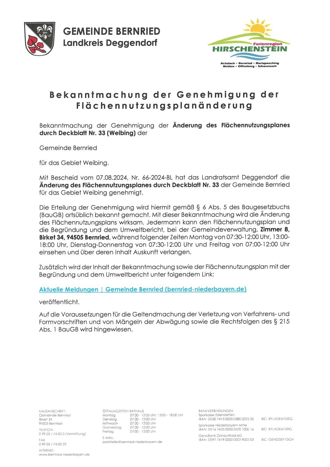 Meldung vom 13.08.2024 Bekanntmachung der Genehmigung der Änderung des Flächennutzungsplanes durch Deckblatt Nr. 33 (Weibing)