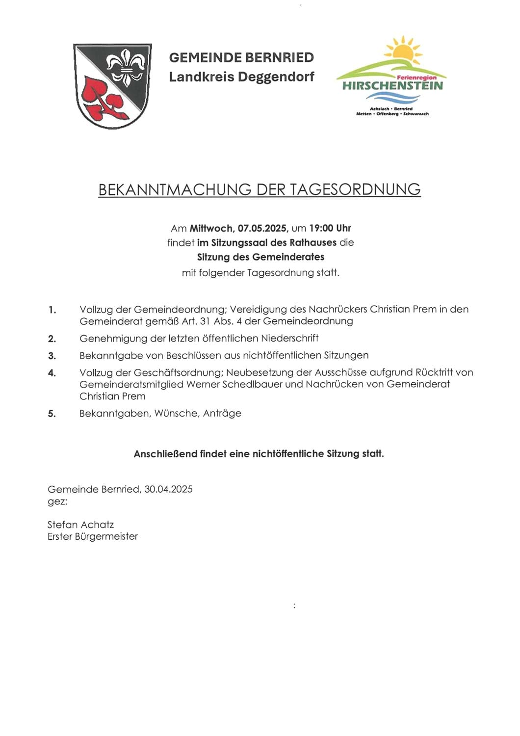 Meldung vom 30.04.2025 Bekanntmachung Gemeinderatssitzung 07.05.2025