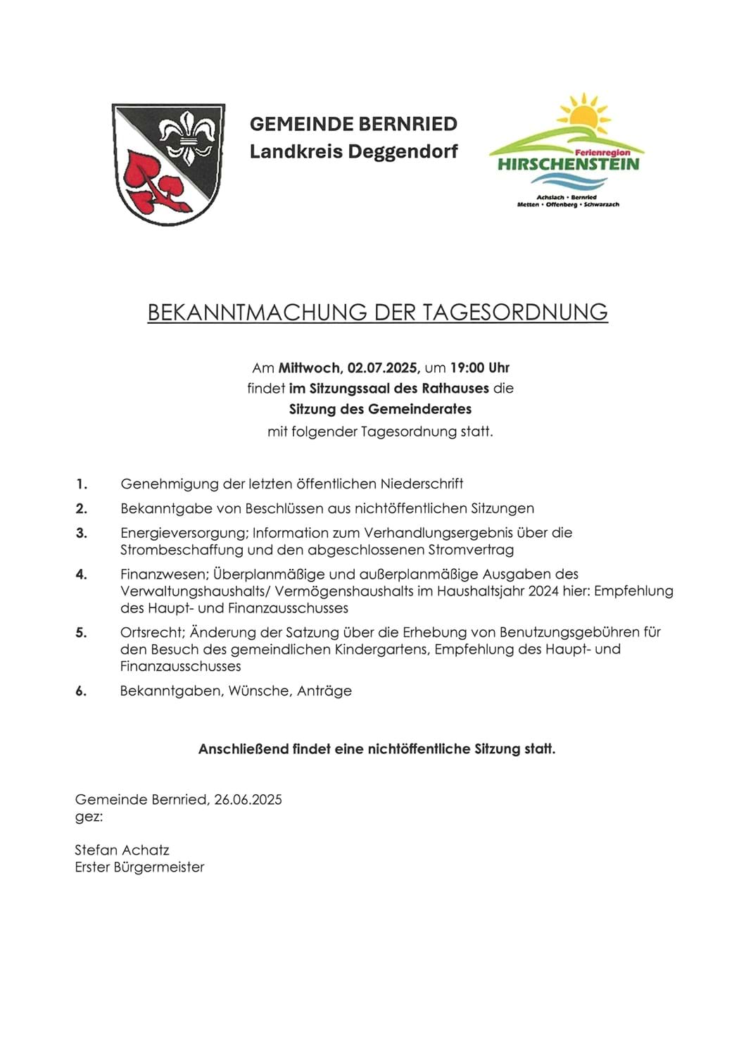Meldung vom 27.06.2025 Bekanntmachung - Gemeinderatssitzung am Mittwoch, 02.07.2025 im Sitzungssaal des Rathauses