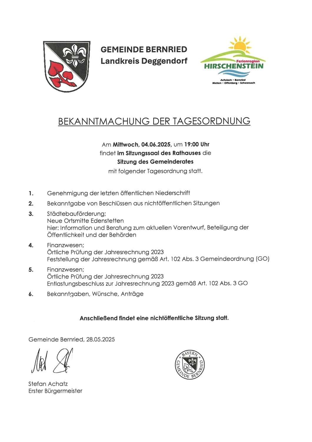 Meldung vom 28.05.2025 Bekanntmachung - Gemeinderatssitzung am Mittwoch, 04.06.2025 im Sitzungssaal des Rathauses