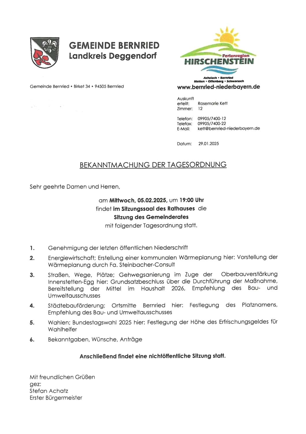 Meldung vom 30.01.2025 Bekanntmachung - Gemeinderatssitzung am Mittwoch, 05.02.2025 im Sitzungssaal des Rathauses