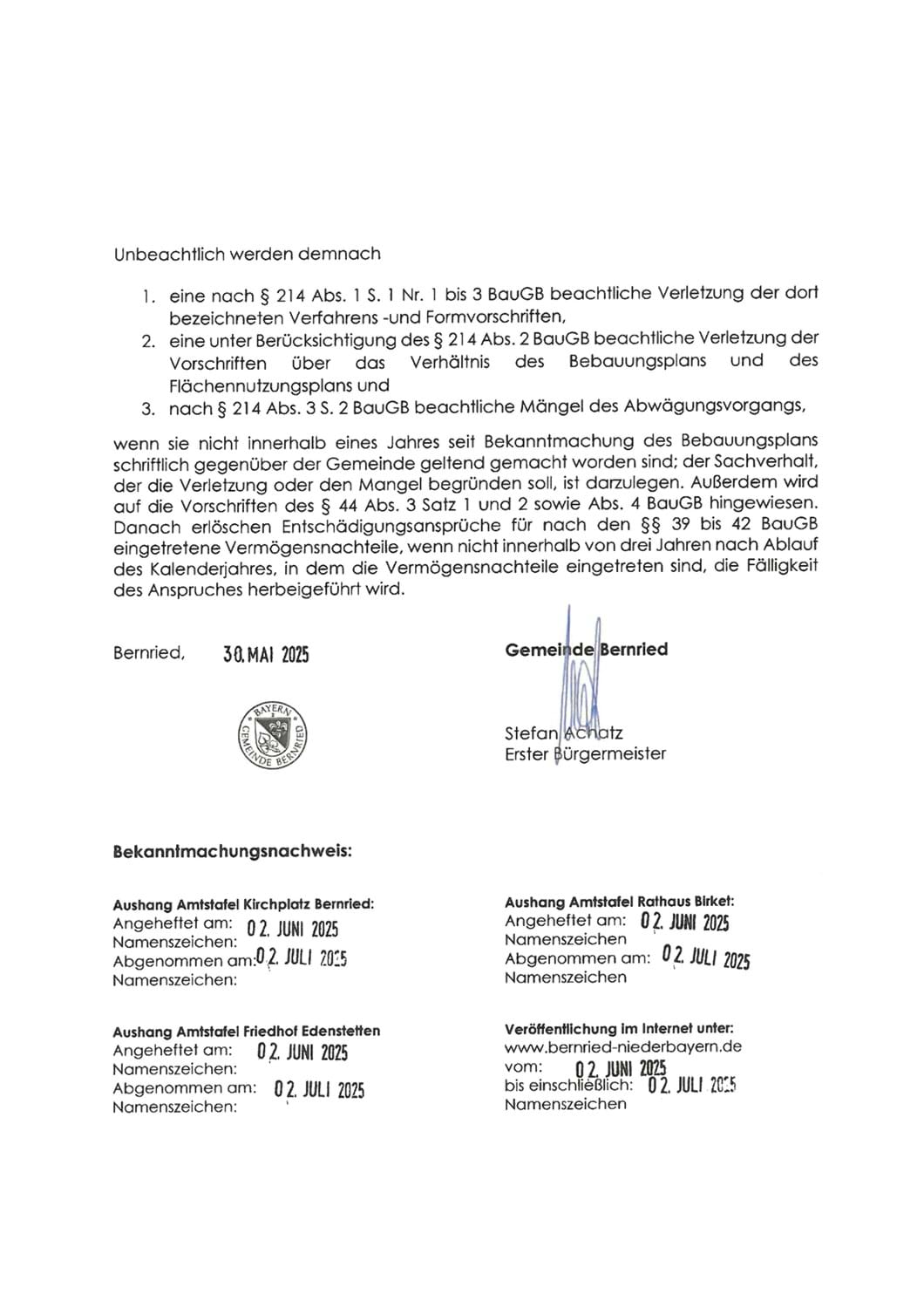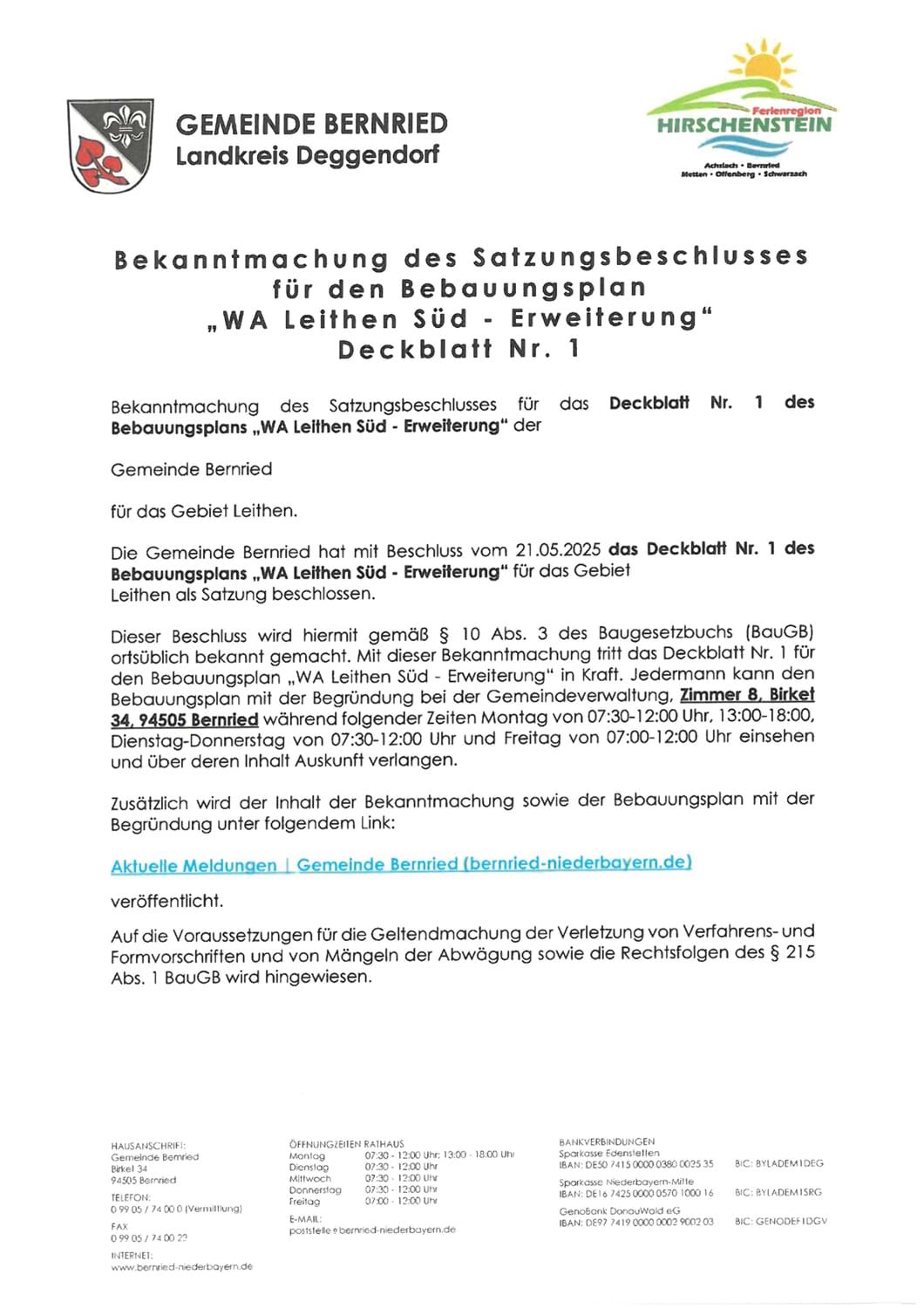 Meldung vom 02.06.2025 Bekanntmachung - Satzungsbeschluss für den Bebauungsplan "WA Leithen Süd - Erweiterung" Deckblatt Nr. 1