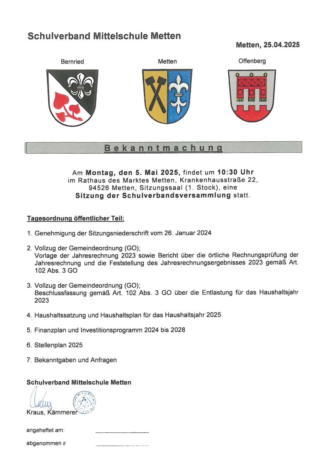 Meldung vom 29.04.2025 Bekanntmachung - Sitzung der Schulverbandsversammlung am Montag, 05.05.2025