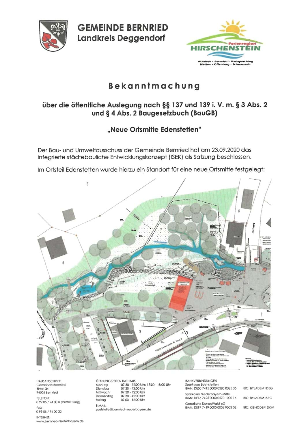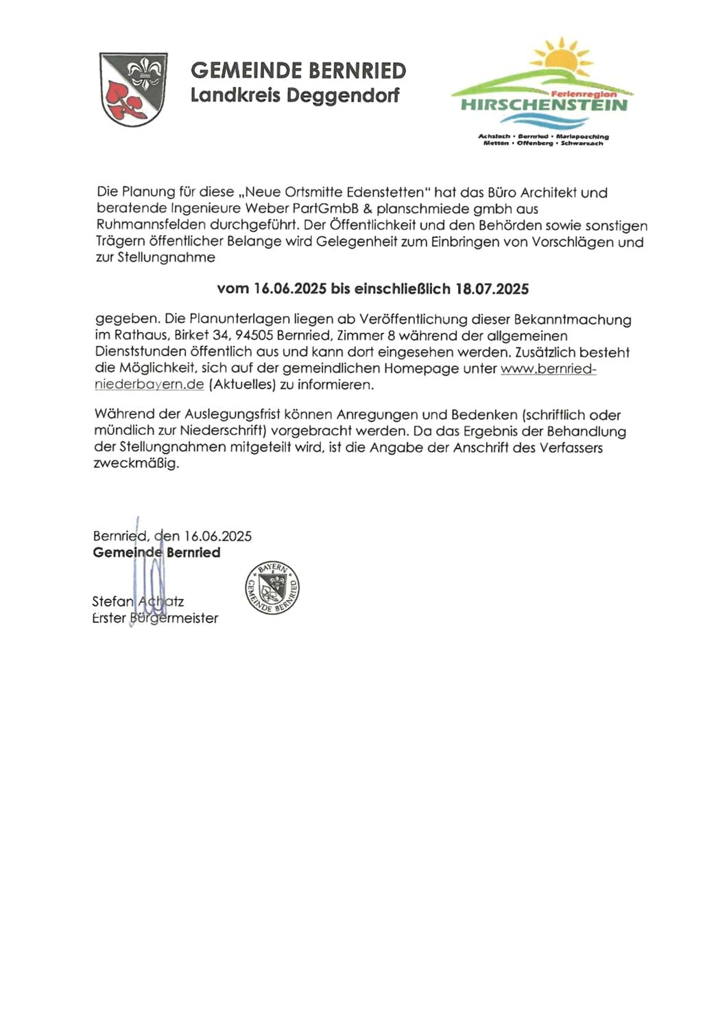 Meldung vom 16.06.2025 Bekanntmachung über die öffentliche Auslegung nach §§ 137 und 139 i. V. m. § 3 Abs. 2 und § 4 Abs. 2 Baugesetzbuch (BauGB) "Neue Ortsmitte Edenstetten"
