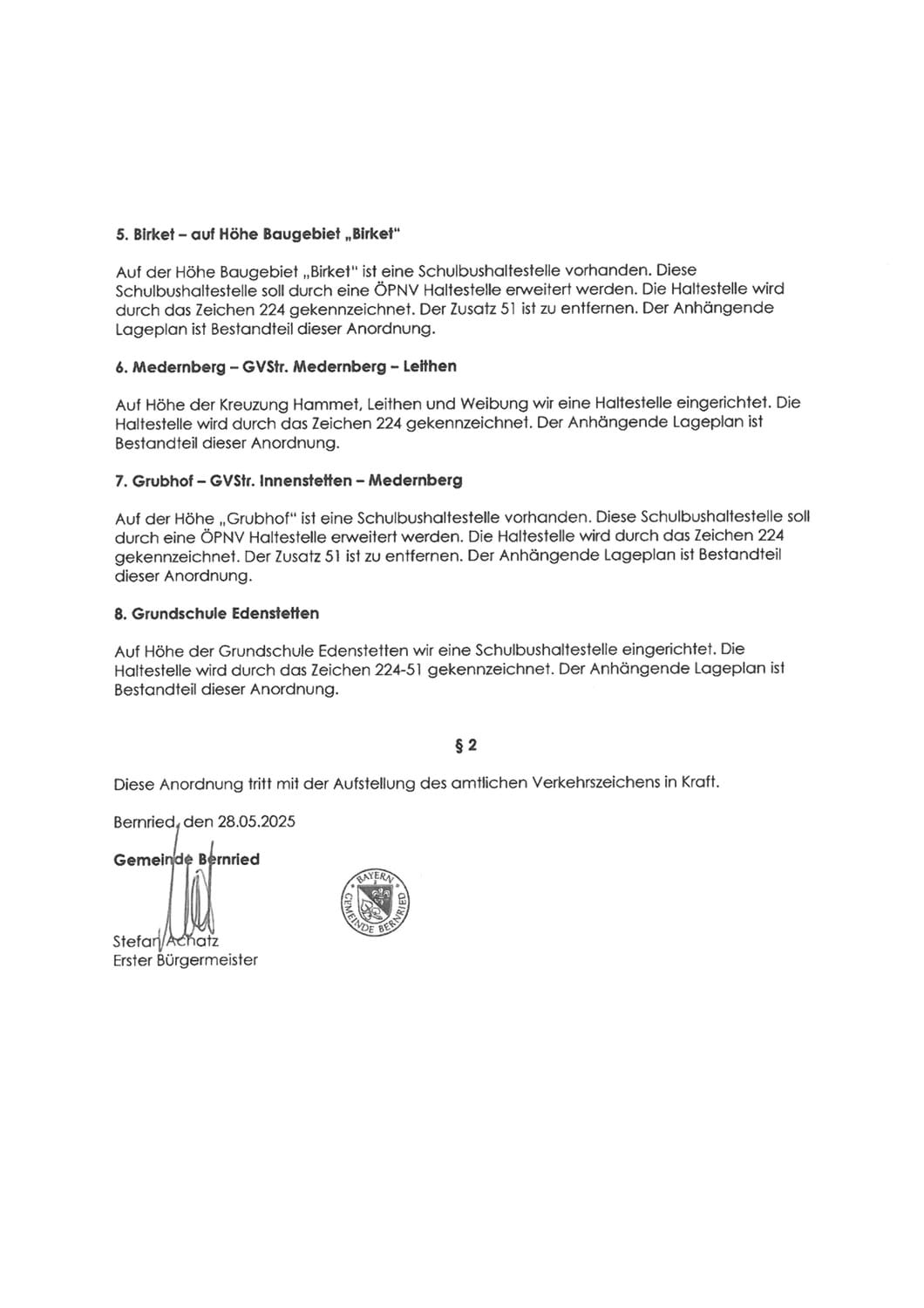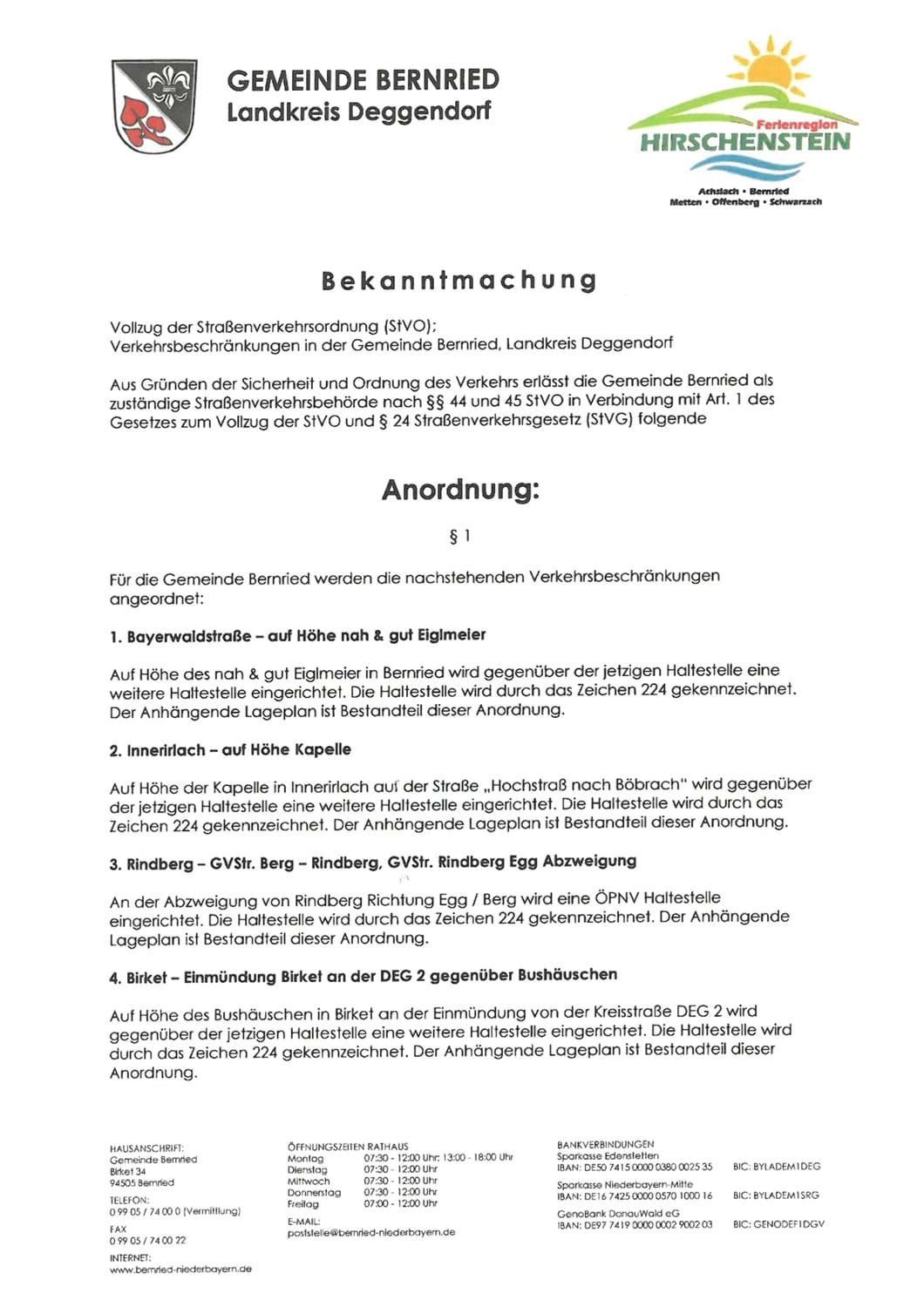 Meldung vom 02.06.2025 Bekanntmachung - Vollzug der Straßenverkehrsordnung; Verkehrsbeschränkungen in der Gemeinde Bernried, Landkreis Deggendorf