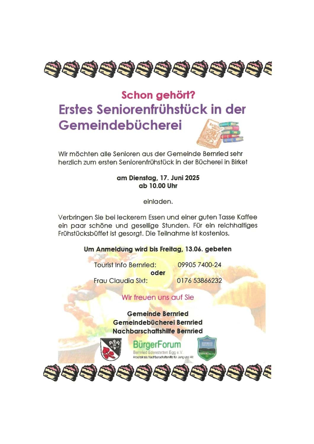 Meldung vom 16.05.2025 Erstes Seniorenfrühstück am Dienstag, 17.06.2025 in der Gemeindebücherei in Birket