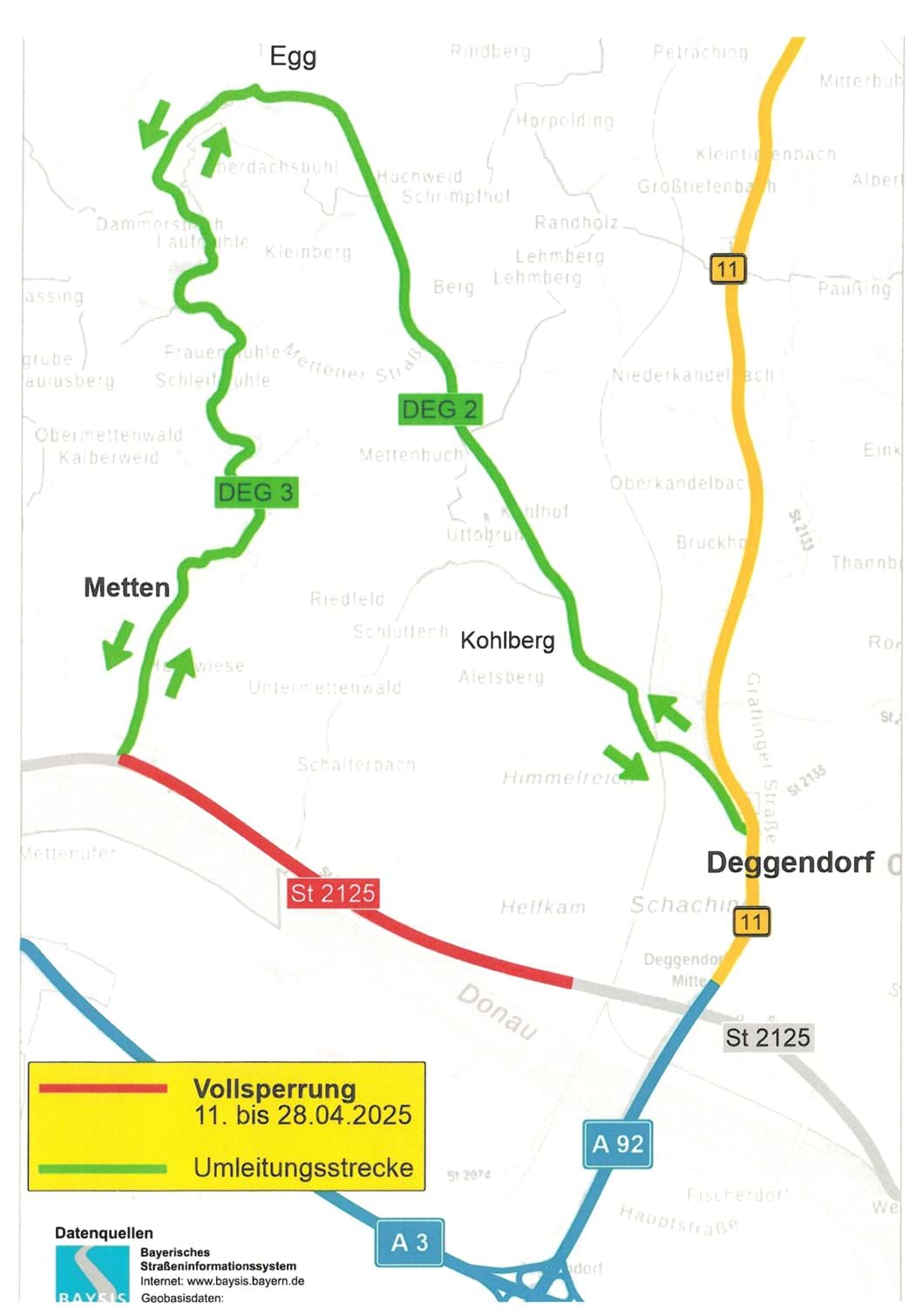 Das Staatliche Bauamt Passau, Servicestelle Deggendorf teilt mit, dass die Staatsstraße 2125 zwischen Deggendorf und Metten saniert wird. Die Vorarbeiten hierfür beginnen am Montag, 07.04.2025 unter halbseitiger Sperrung. Vom 11.04. bis 28.04.2025 wird die Straße voll gesperrt. Der Verkehr wird in diesem Zeitraum über Kohlberg, Egg und Metten (DEG 3 und DEG 2) umgeleitet. Am Montag, 28.04.2025 wird die Sperrung morgens wieder aufgehoben.