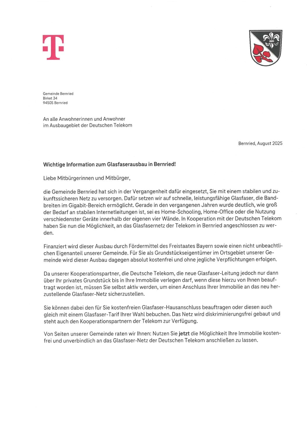 Meldung vom 12.08.2025 Glasfaserausbau - Telekom