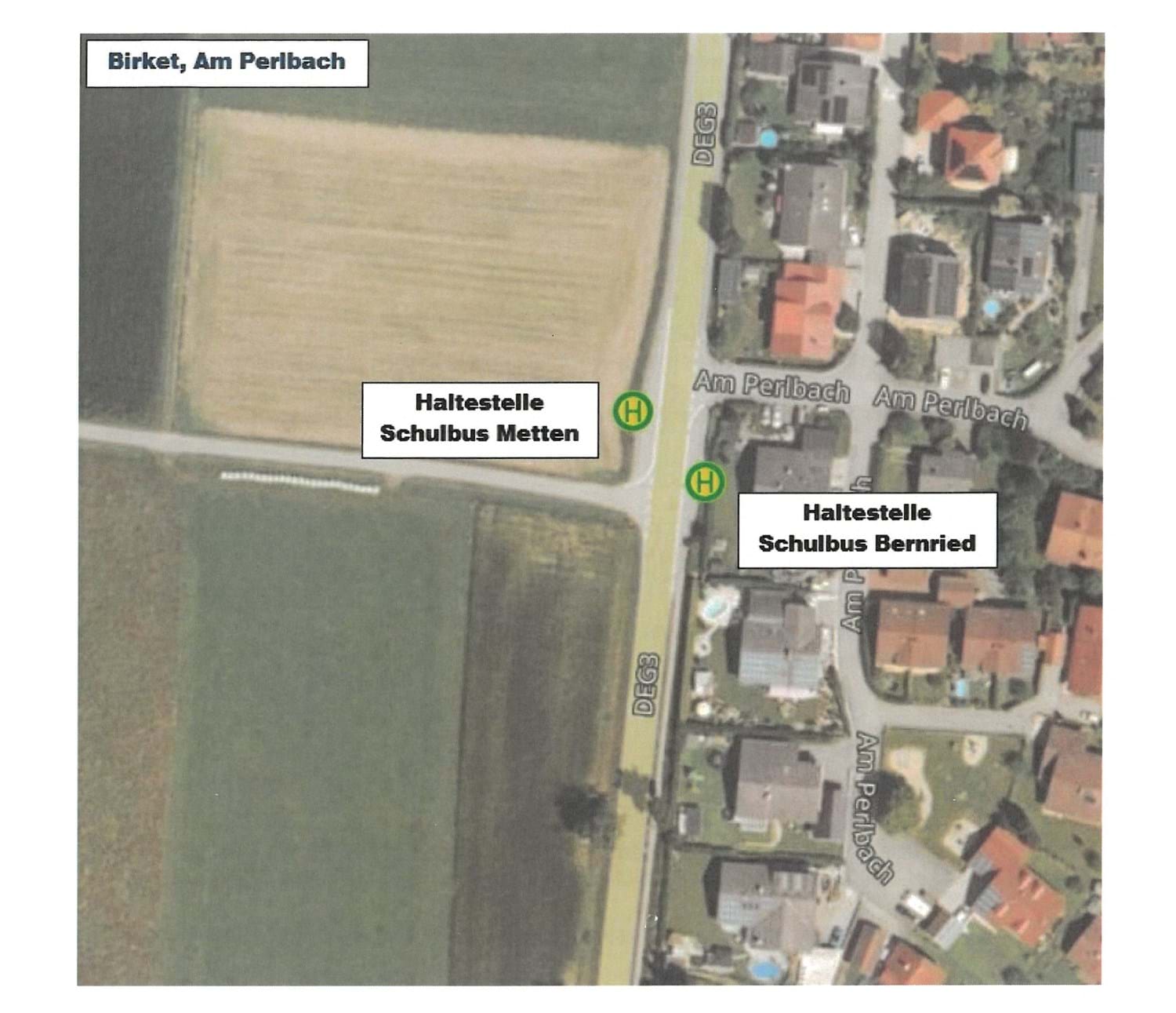 Vom 23.06. bis 25.06. kann der Schulbus, aufgrund der Asphaltarbeiten, die Haltestellen BIRKET, NEUE SIEDLUNG und BIRKETÄCKER NICHT anfahren. Die betroffenen Schüler müssen an der Haltestelle AM PERLBACH (siehe Bild) ein- und aussteigen.