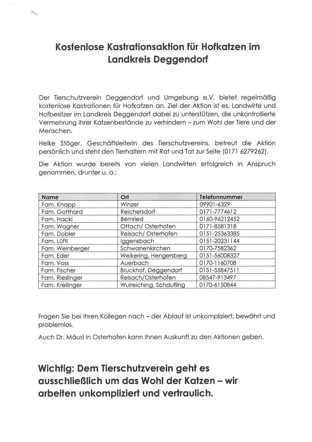 Meldung vom 24.06.2025 Kostenlose Kastrationsaktion für Hofkatzen im Landkreis Deggendorf