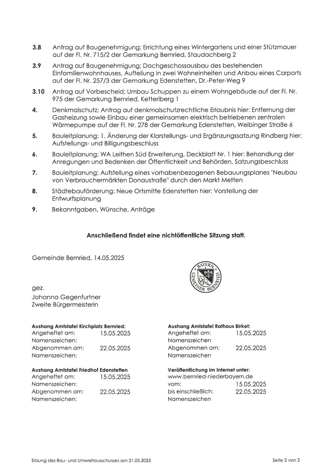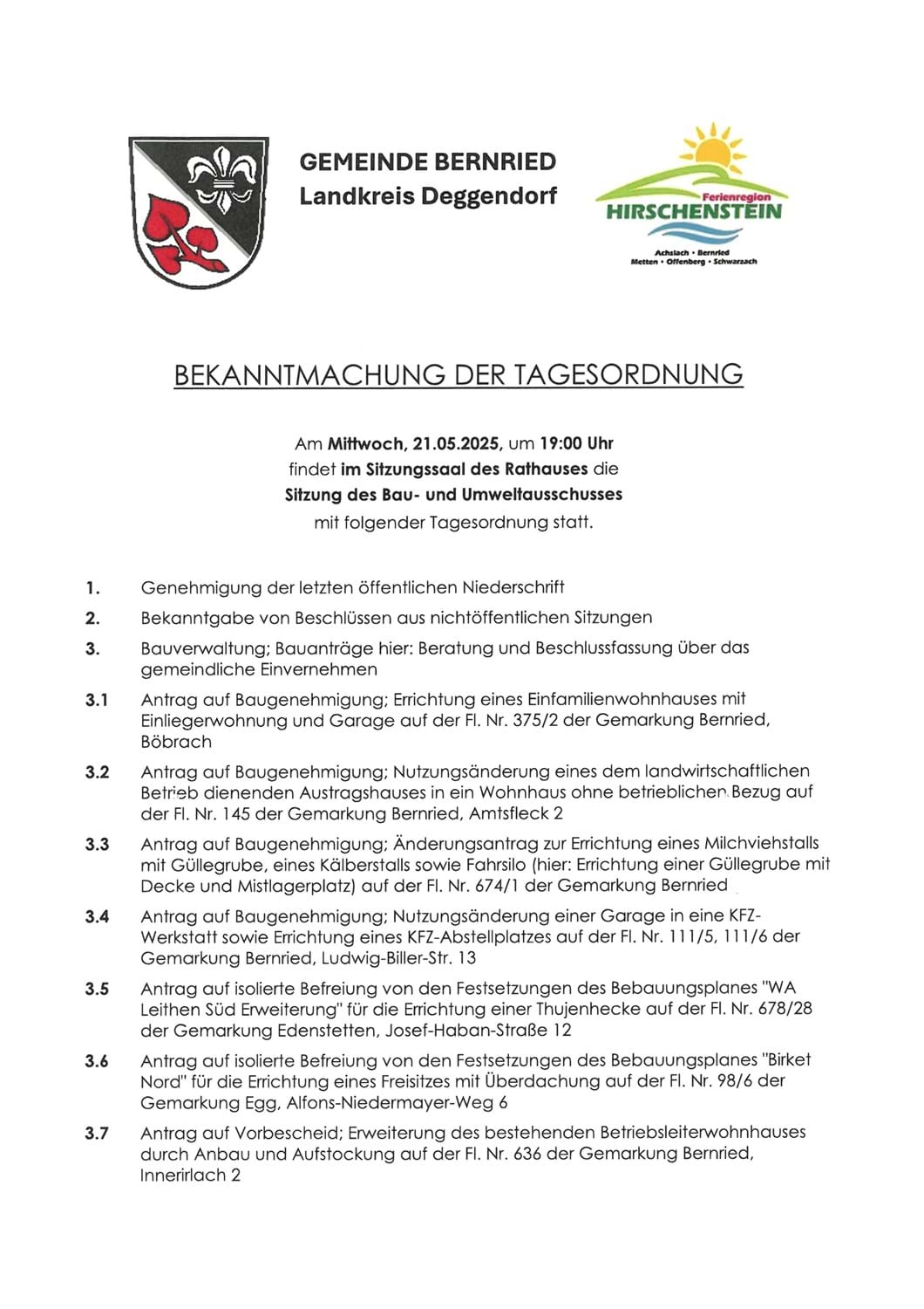 Meldung vom 14.05.2025 Sitzung Bau- und Umweltausschuss am Mittwoch, 21.05.2025