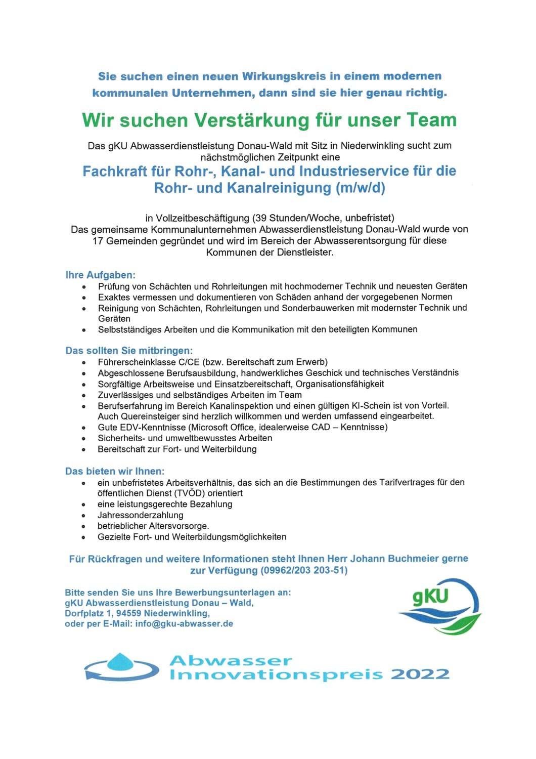 Meldung vom 02.06.2025 Stellenanzeige des gKU für eine Fachkraft für Rohr-, Kanal- und Industrieservice für die Rohr- und Kanalreinigung (m/w/d)