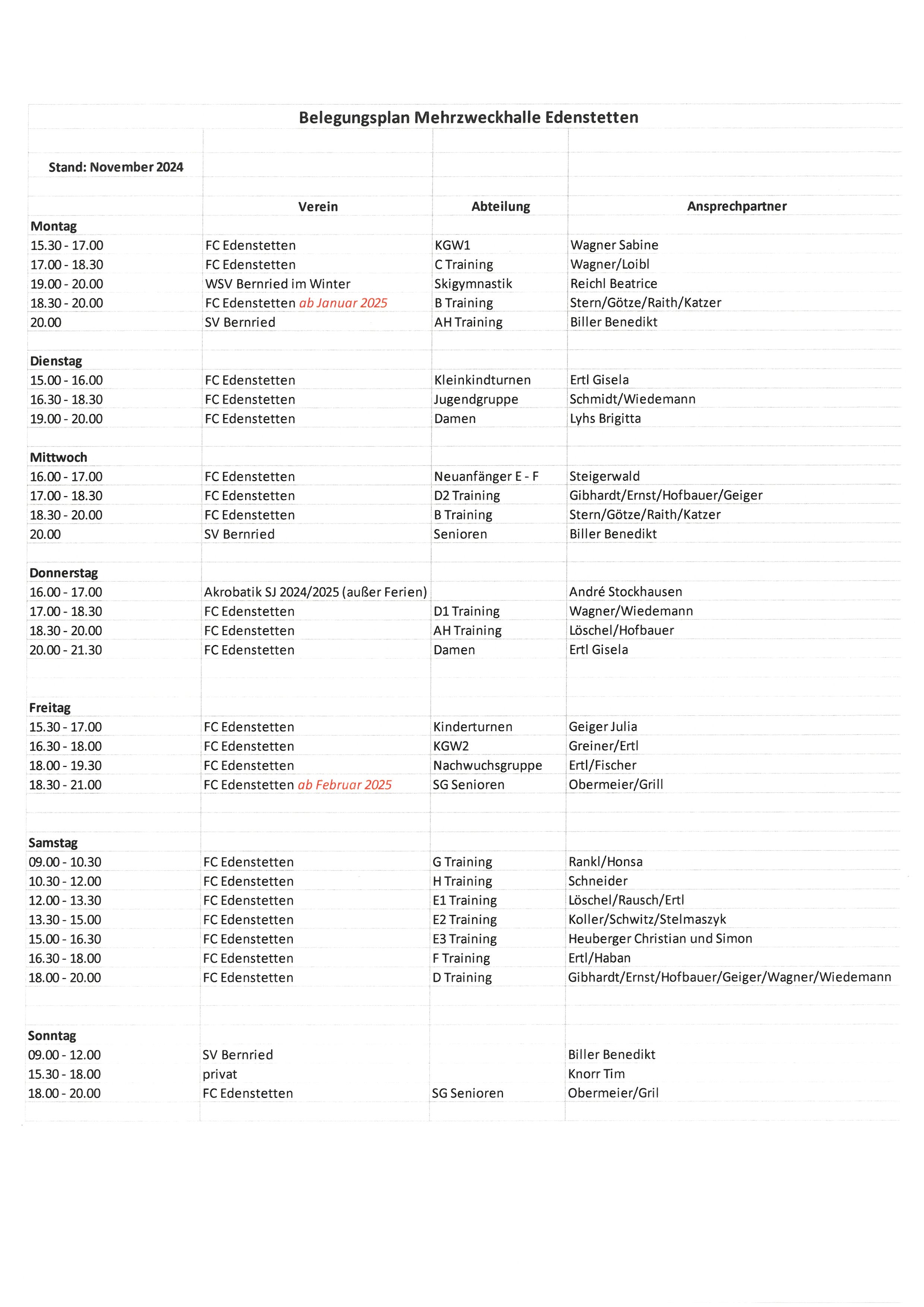 Der aktuelle Belegungsplan der Mehrzweckhalle in Edenstetten ist weiter unten zusammengefasst. Änderungen können sich kurzfristig ergeben. Bei Fragen bitte im Rathaus (09905 7400 13) nachfragen.